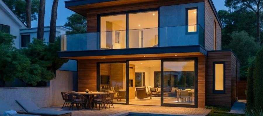 Blue Hour lighting, exterior sky in a deep blue tone, interior lit by warm artificial lights (yellow lamps) creating a warm/cold color contrast, sophisticated and elegant late afternoon atmosphere. - Night light (artificial)